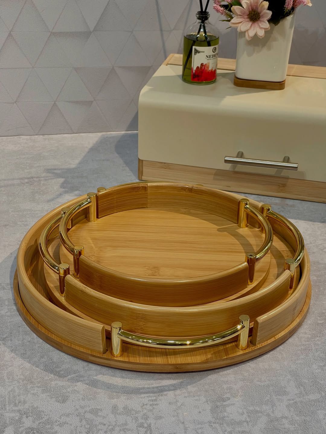 سینی بامبو لبه دار دسته طلایی مدل گرد ست 3 سایز